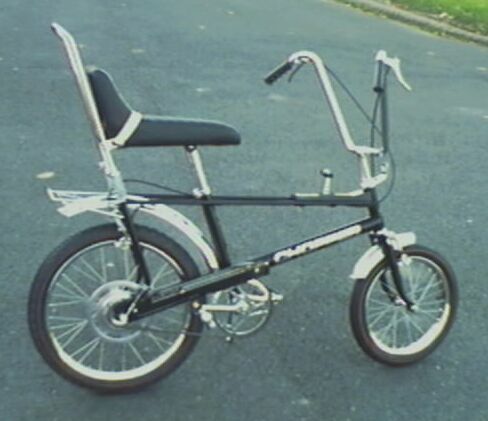 The bike was bought 90% complete but most parts needed to be replaced due to severe rust damage. Im convinced it had been at the bottom of a stagnant pond for a very long time! This was evident by the amount of green algae I had to remove from it and the entirely seized rear hub. Parts I`ve replaced: Both wheel rims, tyres, spokes, rear inner hub mechanism, both mudguards, chainguard, chain, pedals, rear seat springs, seat cover, reflector, gear shifter mechanism, fork dimples, brake levers and handlebar grips. The handlebars were "remanufactured" from two pairs of badly mis-shapen `bars. Each was cut in half and the best halves welded together. You might notice they are a little wider than normal and raked backwards like the mk1. The decals were specially made in chrome vinyl.